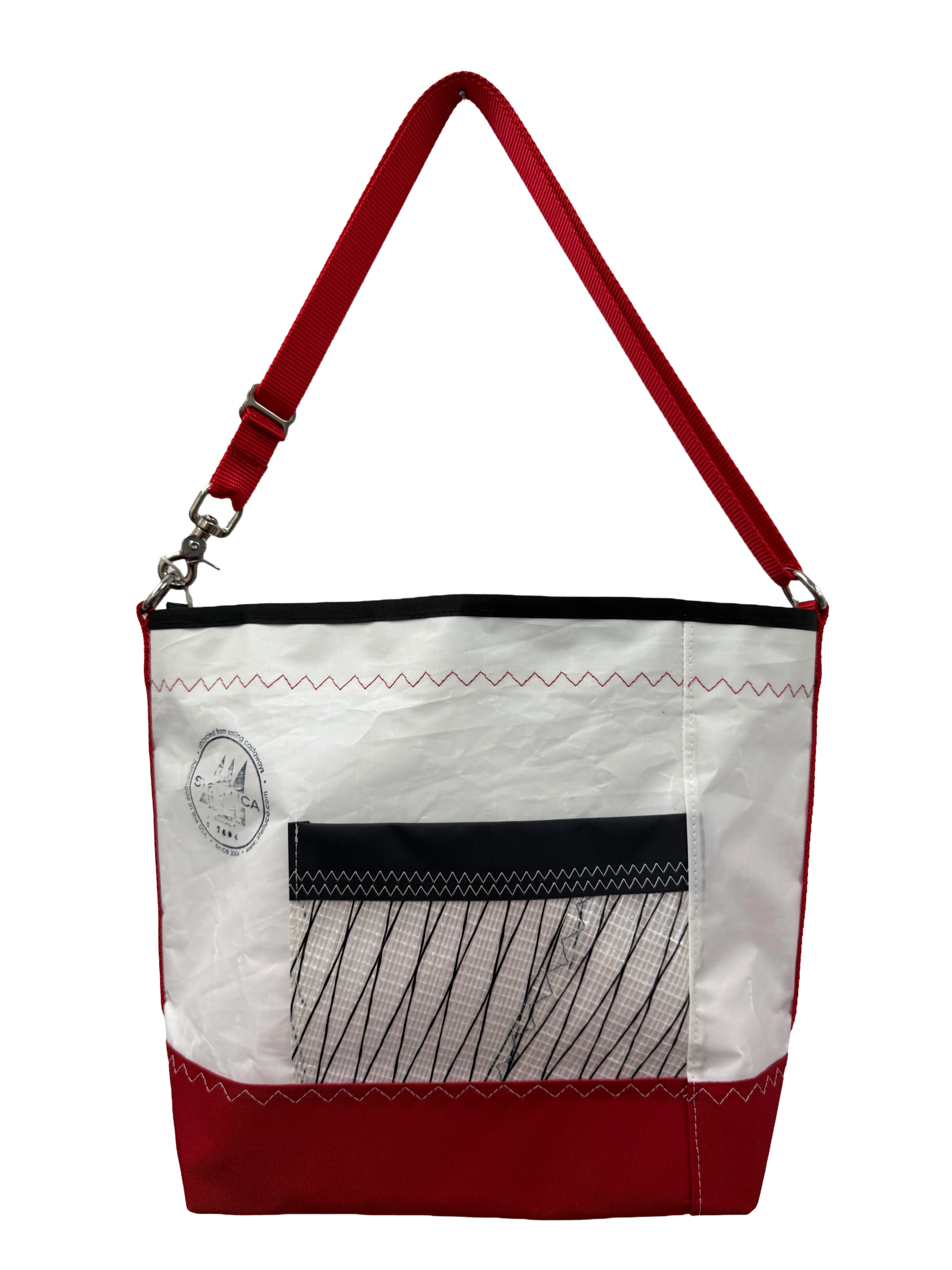 This upcycled sailcloth bag with a red strap, black sail number and red bottom will hold everything you need. Top closure zipper and pockets for your cell phone, water bottle, keys and many other things. Comes with an adjustable strap that can be shortened to 27" or extended to up to 49" for over the shoulder or crossbody use.
