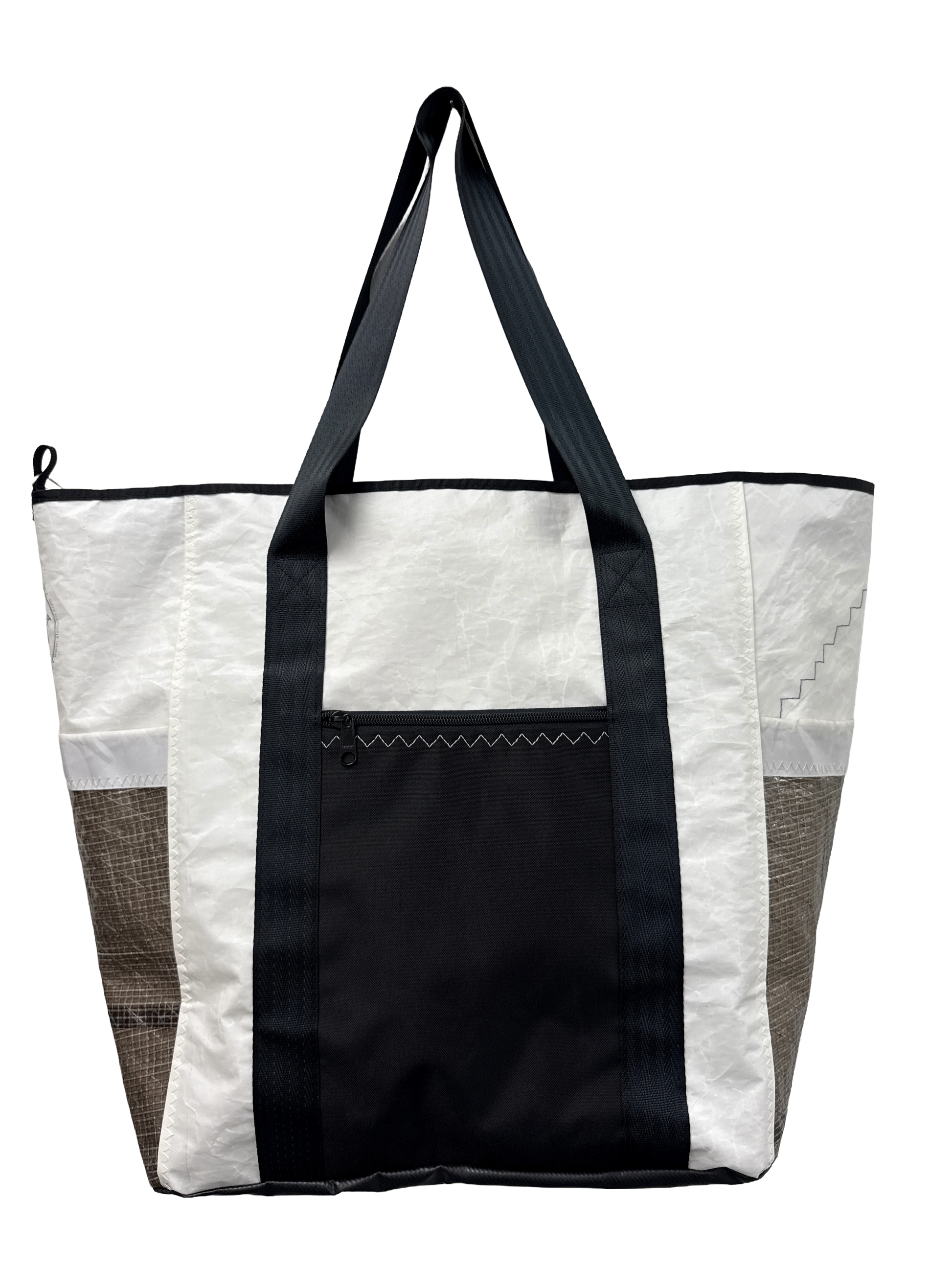 Made from reclaimed sail cloth with reclaimed technical sail side pockets and a red sail logo. Our zippered Beach Totes can fit all of your gear. Water resistant sailcloth and truck tarp keep everything dry and two zippered pockets (one inside and one outside) keep the important things at easy reach.