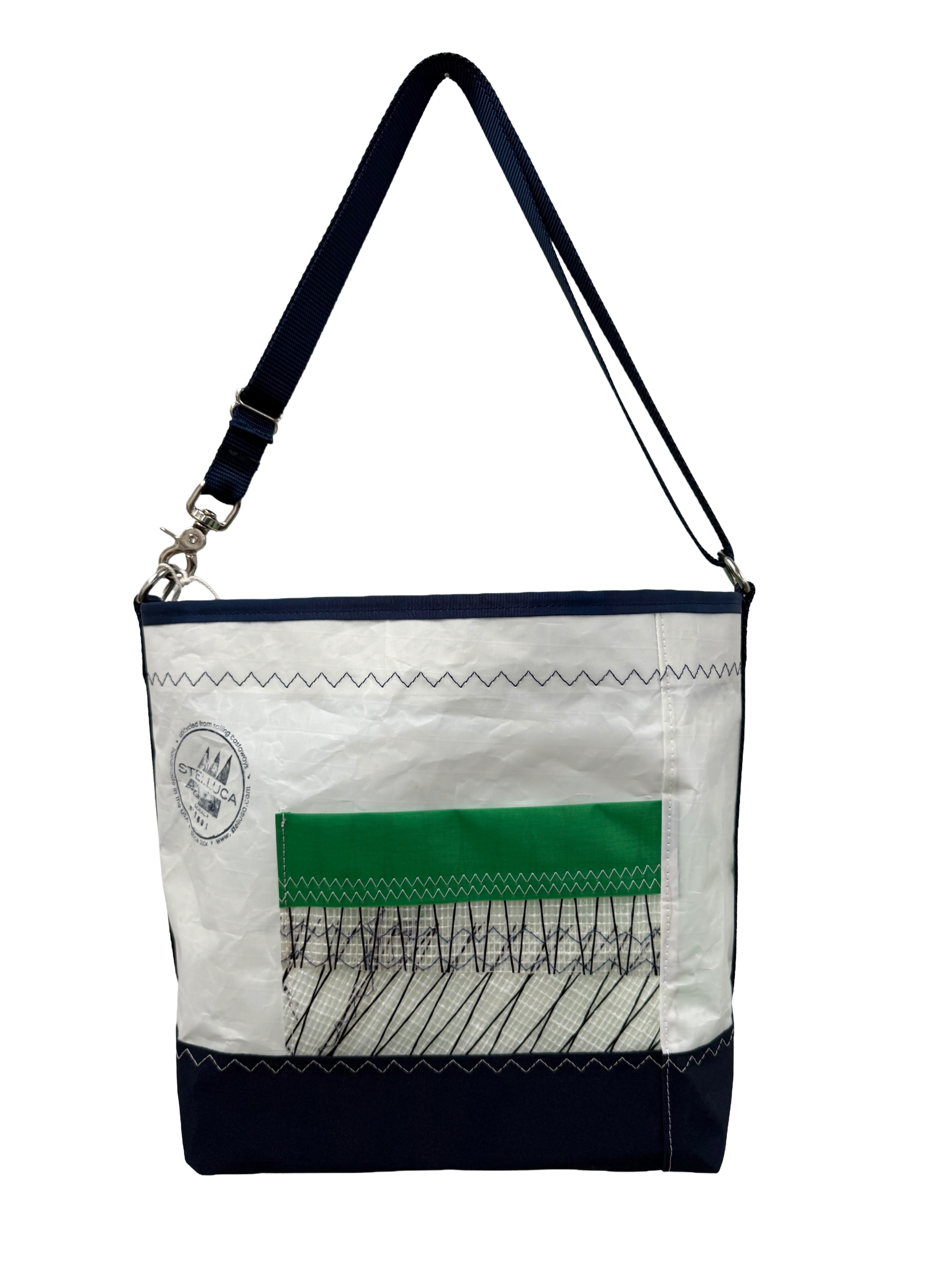 This upcycled sailcloth bag with a navy strap, green sail number and navy bottom will hold everything you need. Top closure zipper and pockets for your cell phone, water bottle, keys and many other things. Comes with an adjustable strap that can be shortened to 27" or extended to up to 49" for over the shoulder or crossbody use.