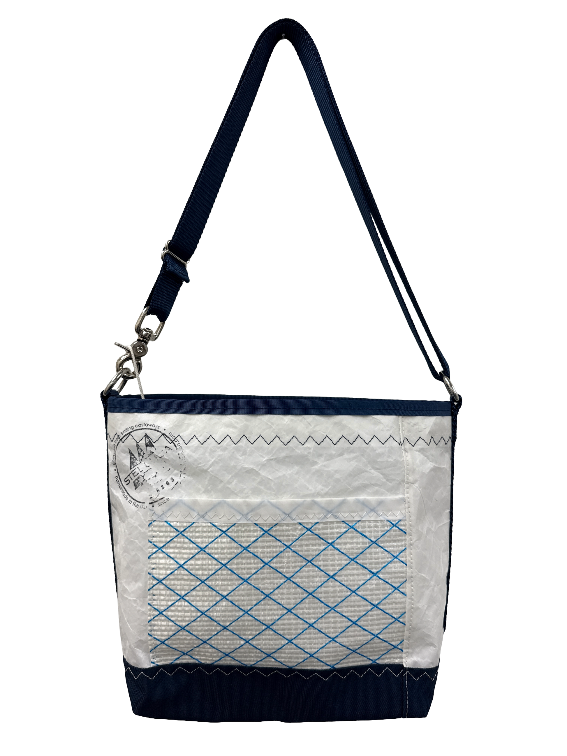 This upcycled sailcloth bag with a navy strap, green sail number and navy bottom.