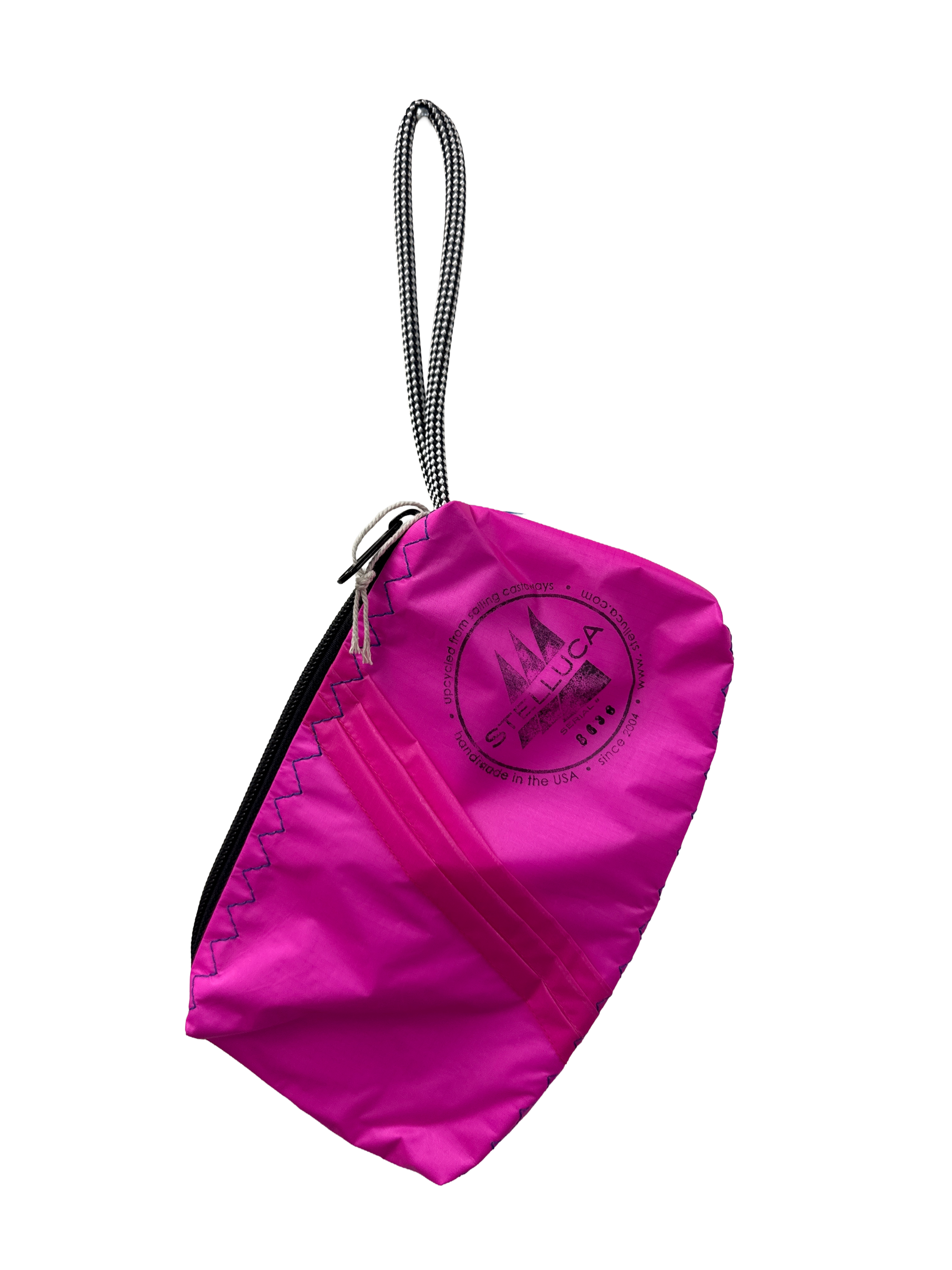 Perfect for the night out! This clutch is made from reclaimed Mylar sailcloth on one side and magenta sailcloth on the other. The high tech rope handle is the perfect size for your wrist and looks great too. Fits a small wallet, cell phone, lipstick, etc. This clutch allows you to keep all of your essentials in one place, and is small enough to toss into your larger bags.