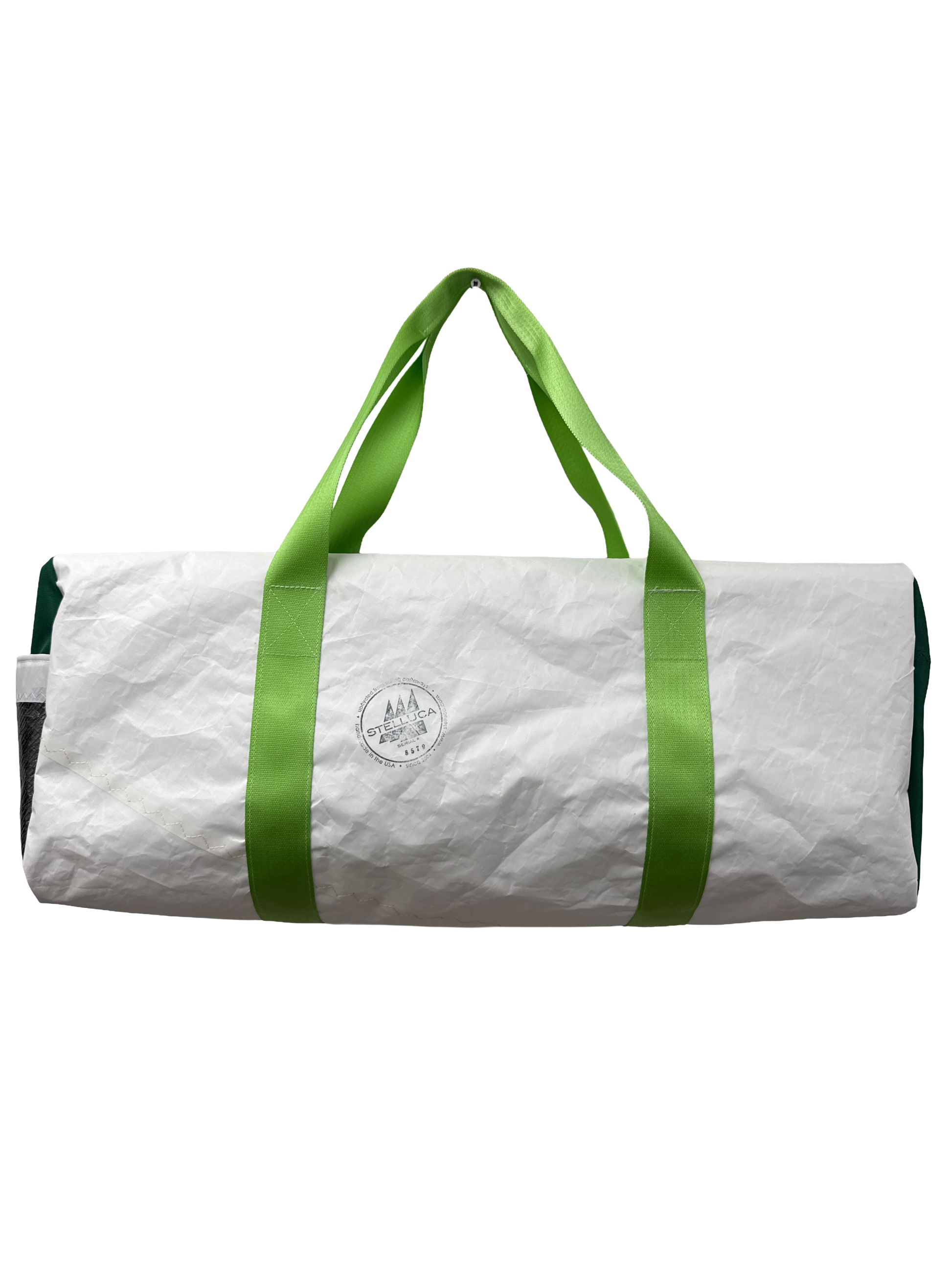 This duffle bag is made from upcycled sail cloth with a navy sail number and green ends. The handles are made of bright green seatbelt. The handles are long enough for you to throw over your shoulders and carry like a backpack.