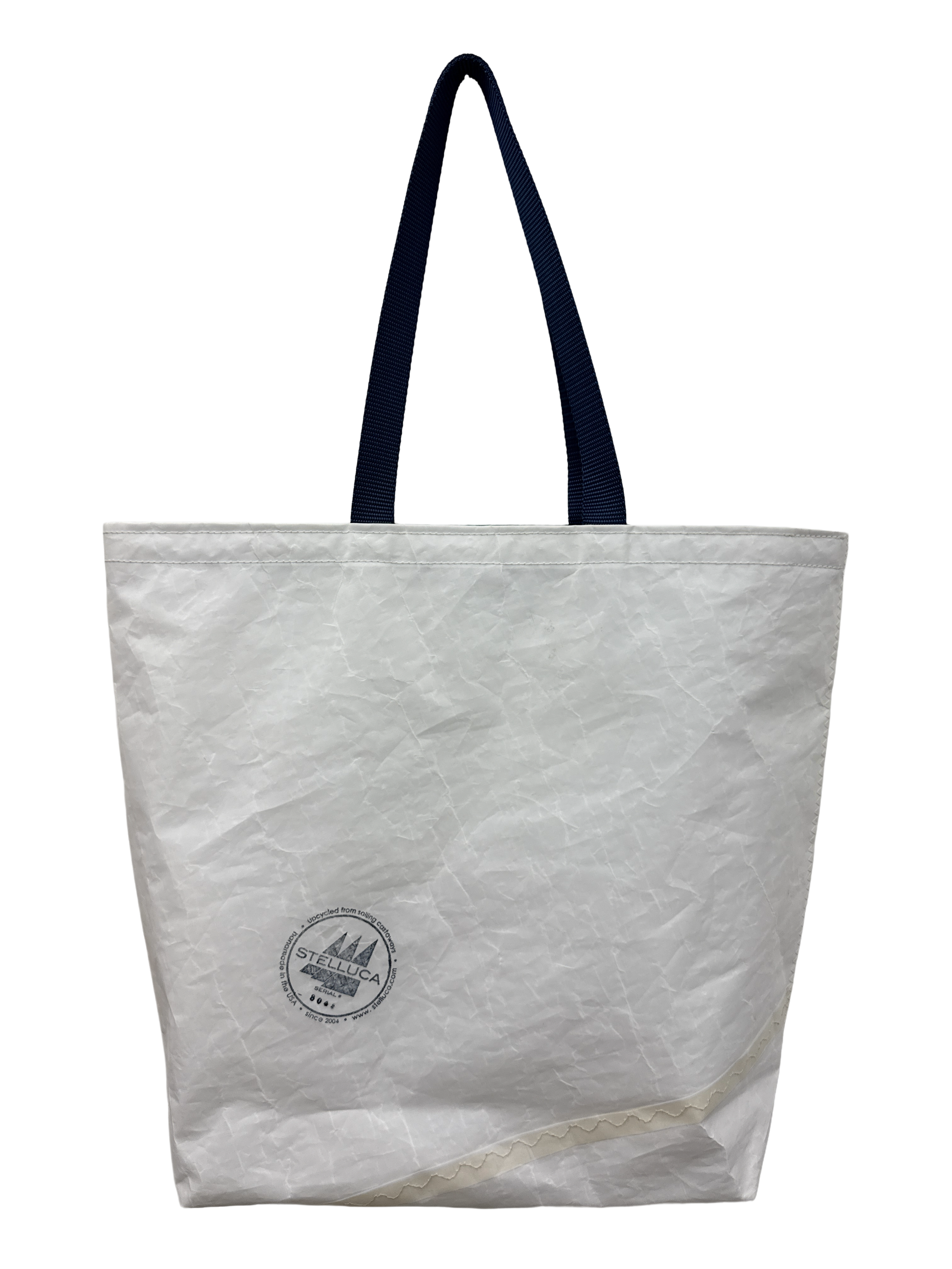 This is the perfect carry-all: beach gear, groceries, snacks, etc. Made from reclaimed sail cloth with 22" navy straps for wearing on your shoulder.