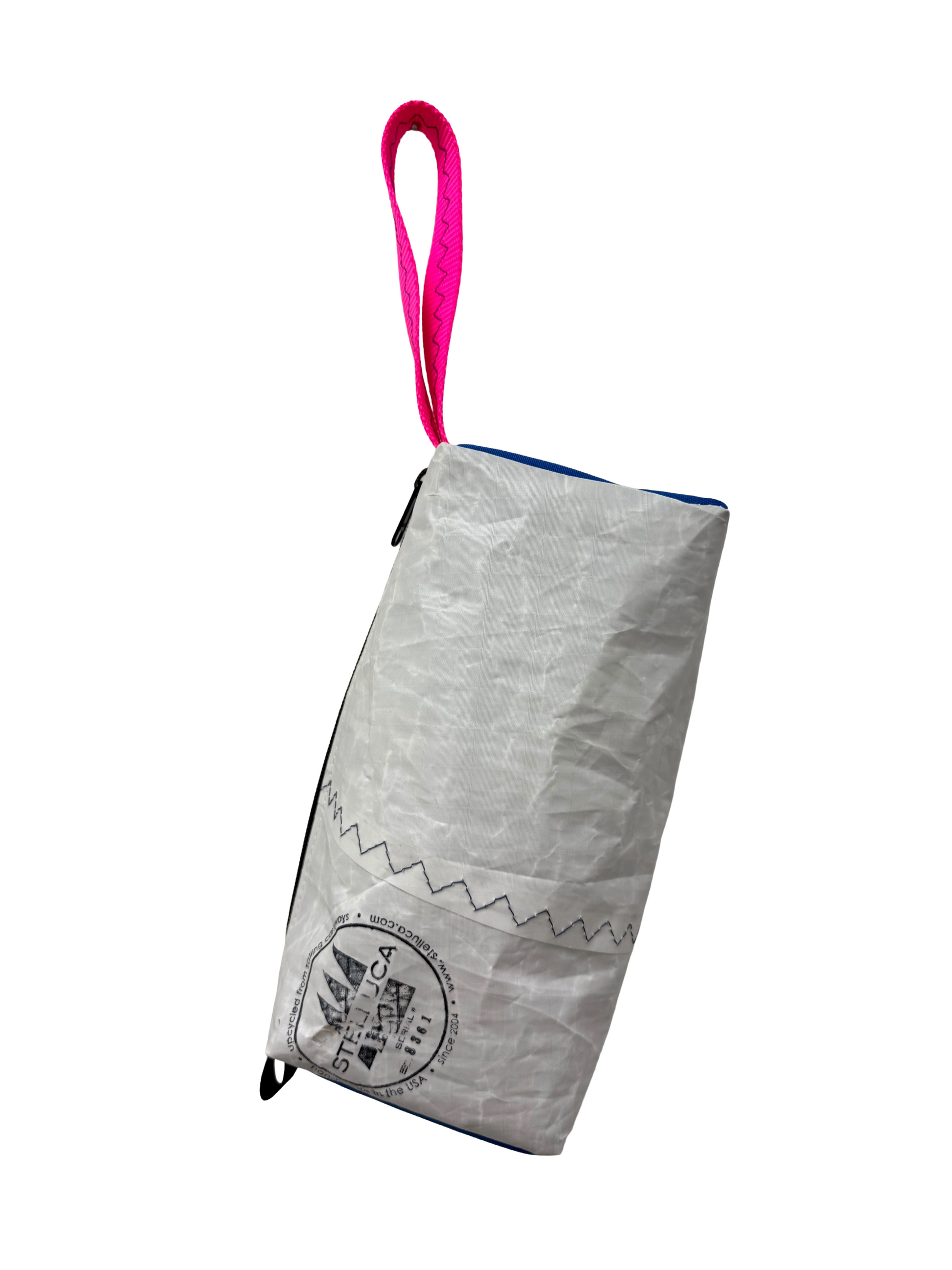 Our toiletry kits are made from soft upcycled sailcloth. There is a reinforced strap to make it easy to grab and throw in a bag. When not in use, they fold almost completely flat for easy storage.