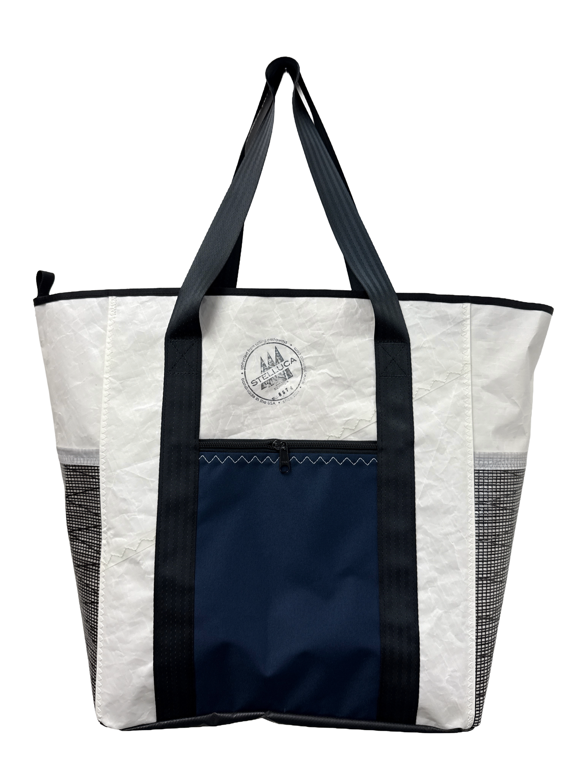 Made from reclaimed sail cloth with reclaimed technical sail side pockets and a red sail letter. Our zippered Beach Totes can fit all of your gear. Water resistant sailcloth and truck tarp keep everything dry and two zippered pockets (one inside and one outside) keep the important things at easy reach.